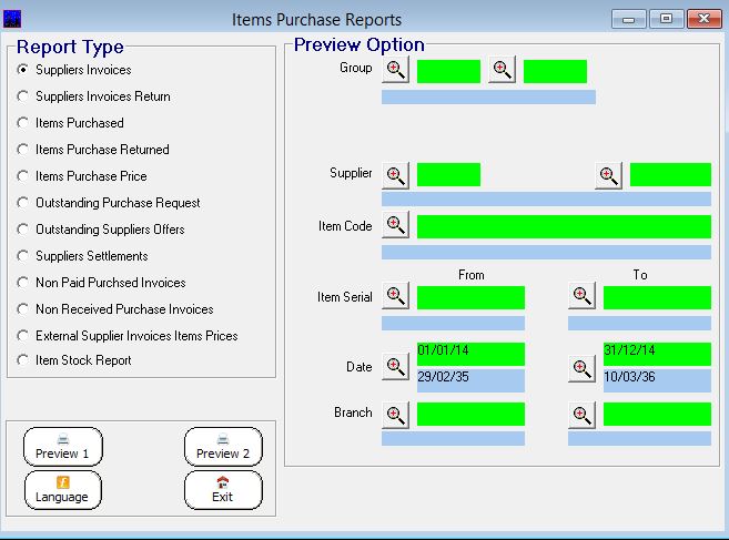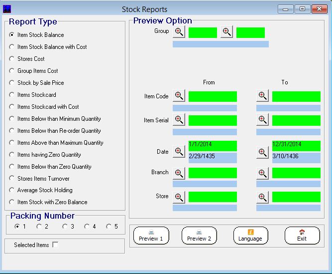 The system is rich with reports as the inventory system only contains at least two hundred reports including items reports, purchases according to the supplier and according to the item, category, invoices and different purchase prices for the one item, suppliers payments, existing proposals. As to the sales reports, they include sales, returns, stagnant items and their turnover rate, most and least movement, according to the seller, according to the customer, according to the branch and many more.