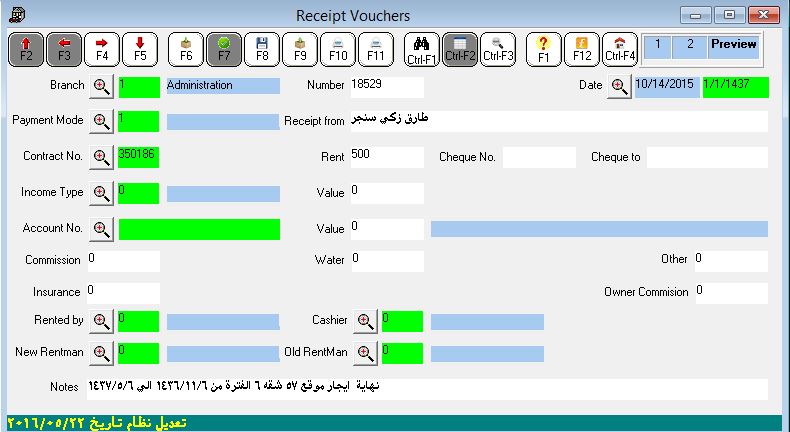 Contarct window includes number of contract, date, first party (owner), ID number and its date and place of issue, second party (tenant) ID number and its date and place of issue, sponsor, contract terms, the method of advance payment, the rented property, its number and type. The information of the rented unit appears automatically such as the location, quarter and rent value. Then the date of rent start. Noting that if it is currently occupied, the program will not accept and gives you a message of this. Then you choose the sum of the rent, number of payments, then the program divides the amount on dates of payments and gives you an alarm automatically before its due date by a period specified by you and it makes the due entry automatically in its date. In addition, the values of brokerage, water, orchard, insurance and reading electricity counter. The system makes the sound accounting entries for the owners, tenants, office brokerage and contracts secretariats.